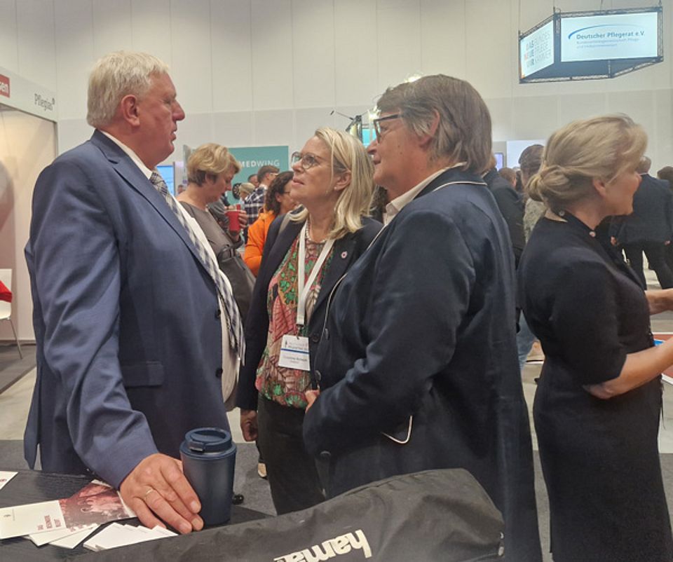 Der Verband der Schwesternschaften vom DRK e.V. (VdS) war in diesem Jahr wieder mit einem eigenen Stand - gemeinsam mit der DRK-Schwesternschaft Berlin e.V. - im Rahmen der Fachausstellung vertreten. Der Stand war ein zentraler Anlaufpunkt für Schwesternschaftsmitglieder, Pflegefachkräfte sowie Vertreter anderer Fachverbände und Politik, darunter auch Karl-Josef Laumann (Foto), Minister für Arbeit, Gesundheit und Soziales des Landes Nordrhein-Westfalen. Neben allgemeinen pflegepolitischen Themen wurde auch das Thema "Community Health Nursing" ausgiebig diskutiert. Die Ergebnisse der vom VdS und DBfK gemeinsam veranstalteten Podiumsdiskussion "Community Health Nurse 2035 - von der Vision zur Wirklichkeit", an der Vertreter/innen der Profession Pflege, Patient/innen, Politik und Ärzteschaft teilgenommen haben, finden Sie hier.